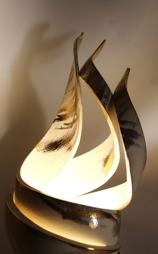 Chaque création est une création unique, tournée sur un tour de potier, puis ajourée et modelée, révélant son propre mouvement où la lumière s’unit à la feuille d’Or.